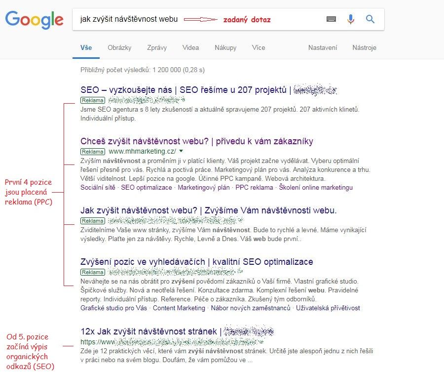 Pokud začnete cokoliv vyhledávat v internetových vyhledávačích jako jsou google.cz, seznam.cz, centrum.cz apod., ve výsledcích se vám na prvních místech zobrazí právě PPC reklama. Až pod nimi uvidíte nabídku z tzv. organického vyhledávání, která je výsledkem kvalitní SEO optimalizace. Rozdíl je v tom, že když se na váš web proklikne uživatel prostřednictvím PPC, tak za každý takový proklik zaplatíte. Pokud je PPC kampaň spravována správně, uvidí ji však uživatel vždy dříve a je tak větší šance, že ho právě vy dokážete zaujmout.
